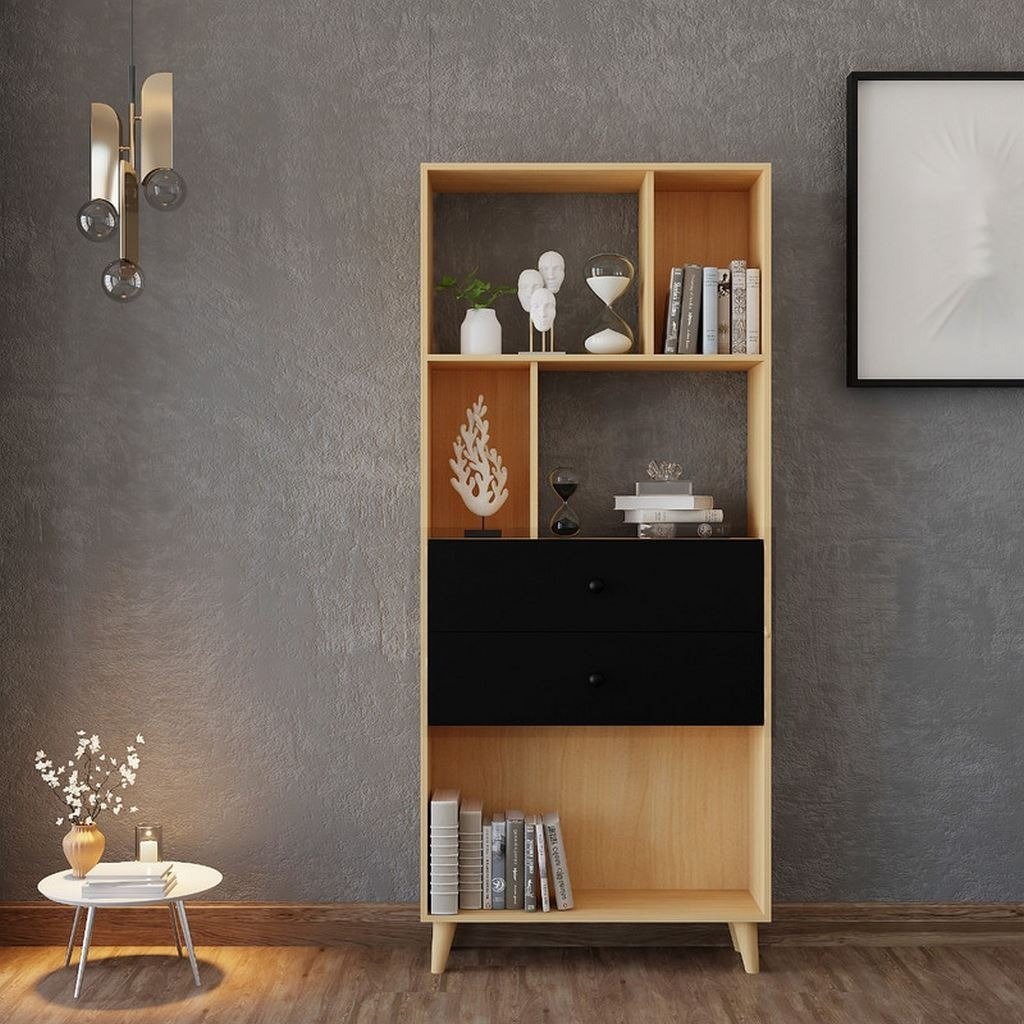 وحدة تخزين أنيقة لون بيج مع أسود لمحبين الألوان الداكنة والفخمة، تحوي درجين مميزين باللون الأسود مع أرفف مفتوحة متنوعة المساحة باللون البيج، لتكون إضافة مميزة وفاخرة لمنزلك الأنيق.